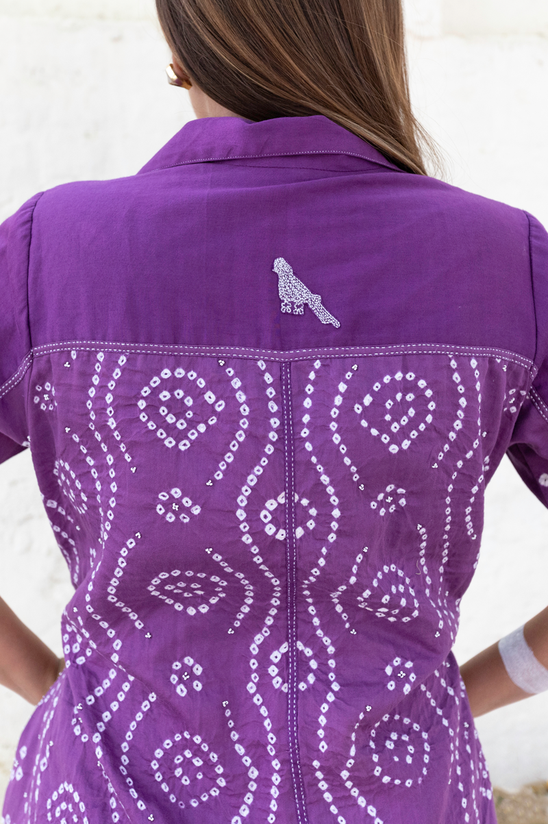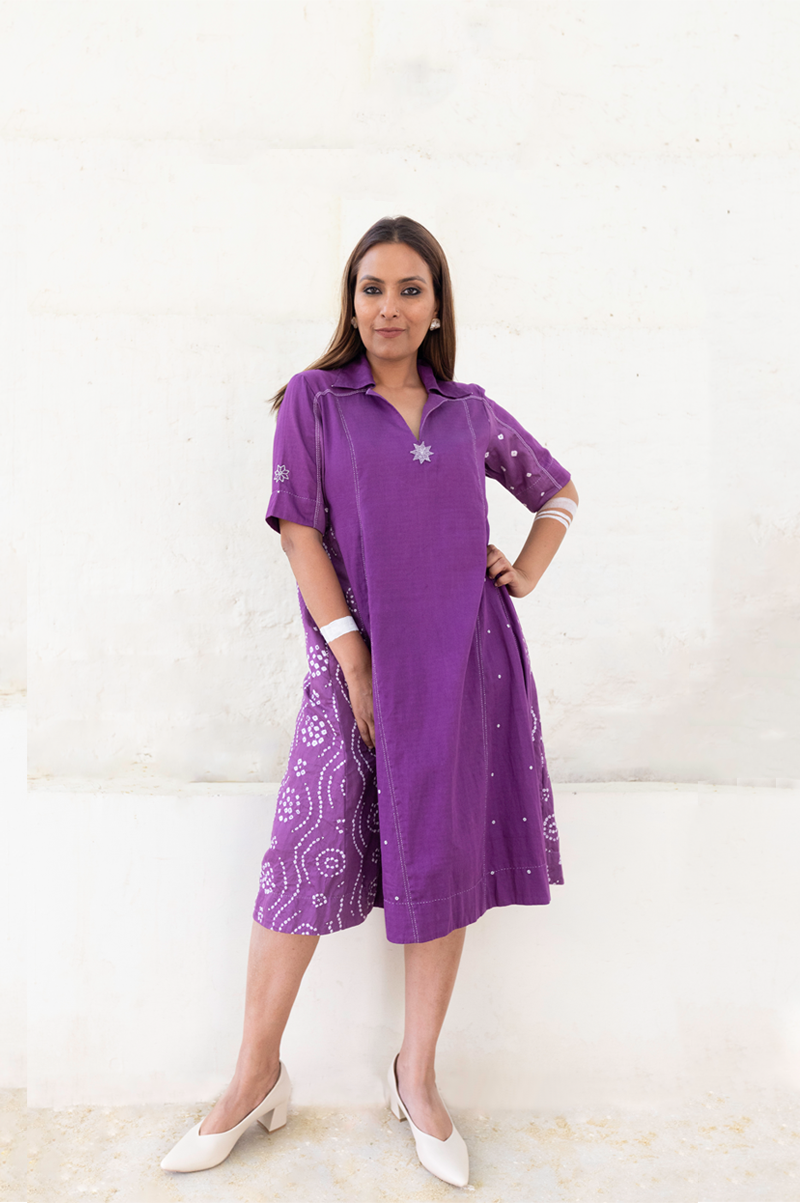 Rich purple cotton dress with hand-held bandhani panels. Embroidered dot work across the sleeves and in the godets.
